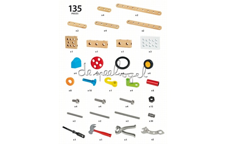 Ontwerp en bouw je eigen constructies! Met deze onderdelen en gereedschappen kun je bijna alles bouwen wat je kunt verzinnen. Een leuke manier om de oog-handcoördinatie te oefenen en creatieve dingen te bouwen. Met bouwstukken, waaronder moeren, bouten, een hamer en een schroevendraaier.
