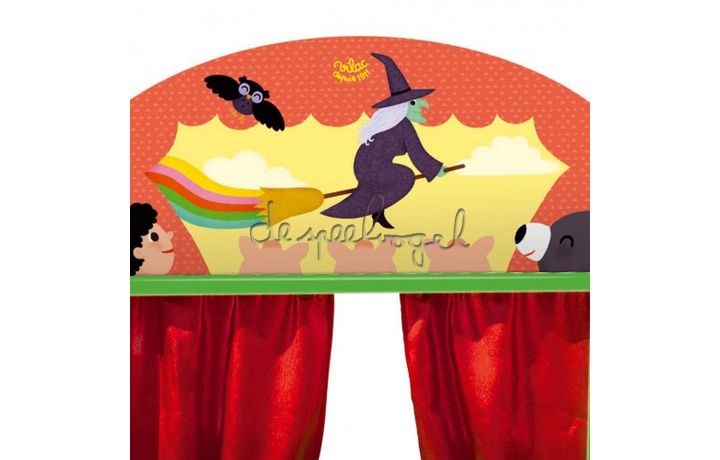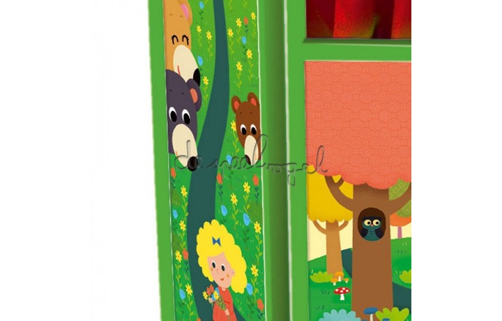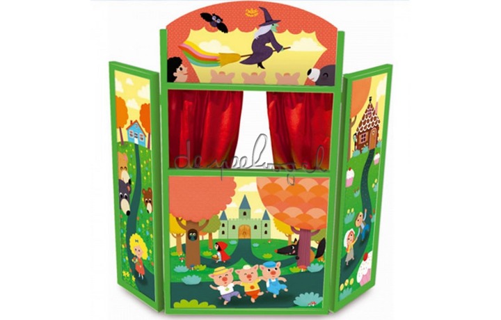 Een mooie nostalgische gekleurde houten poppenkast met prachtige sprookjesillustraties Vilac.