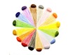 Non-toxic, all natural soy wax crayons in 16 colors: red, green, blue, egg yolk yellow, black, brown, orange, purple, pink, grass green, sky blue, sunshine yellow, gray, tan, peach in een rood fluwelen zakje