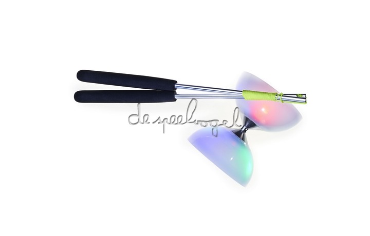 Set van een diabolo met LEDlichtjes en stokjes, handig verpakt in een netje.