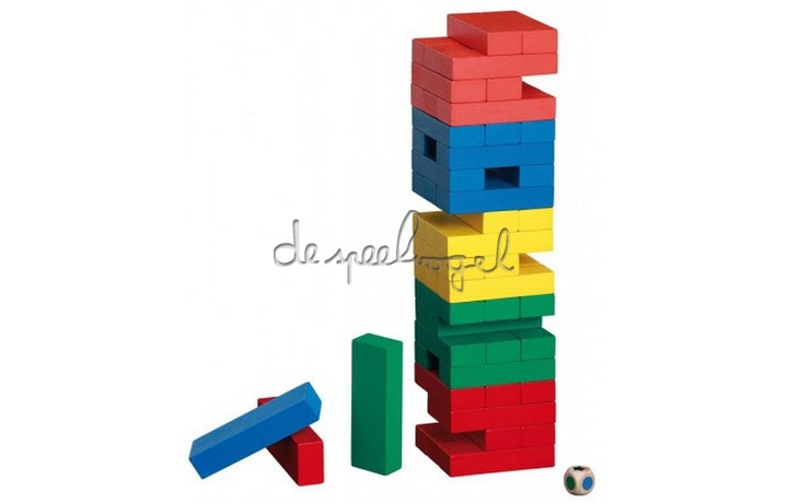 Het bekende vallende torenspel. Gekleurd uitgevoerd: de dobbelsteen geeft aan welke kleur je uit de toren moet trekken.