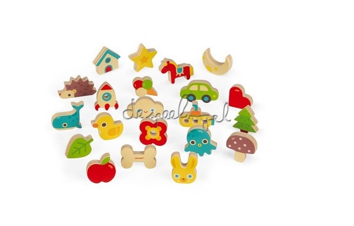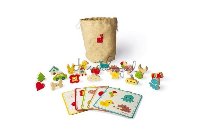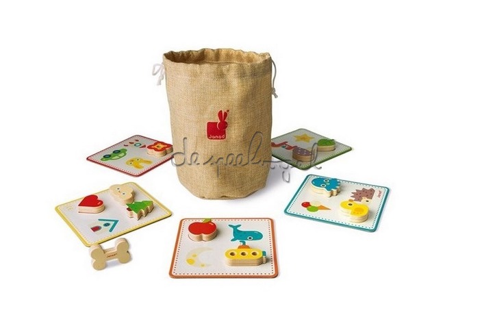 21 houten stukken, een katoenen zak en 5 speelkaarten. Steek je hand in de tas en probeer als eerste de 4 stukken te vinden die op de spelkaart staan, met alleen je tastzin! Maar pas op voor het "trick" stuk! De speler die het bot kiest, moet alle reeds gewonnen stukken in de zak teruggeven.