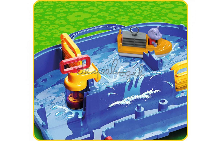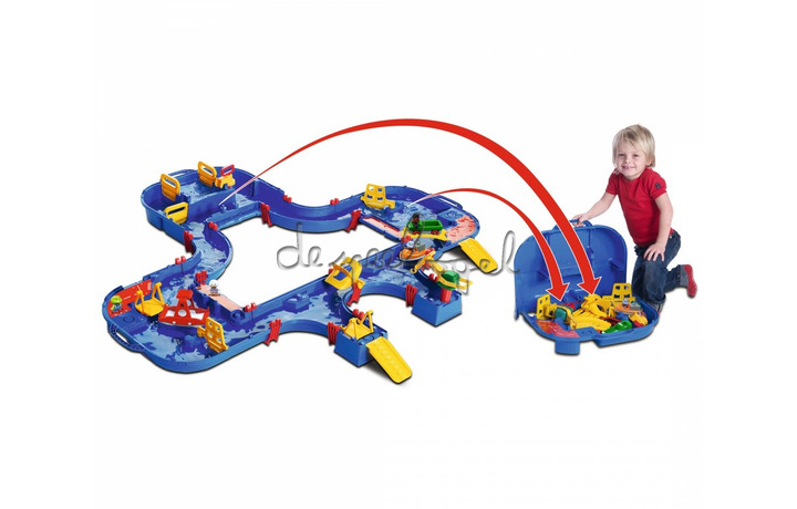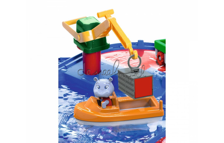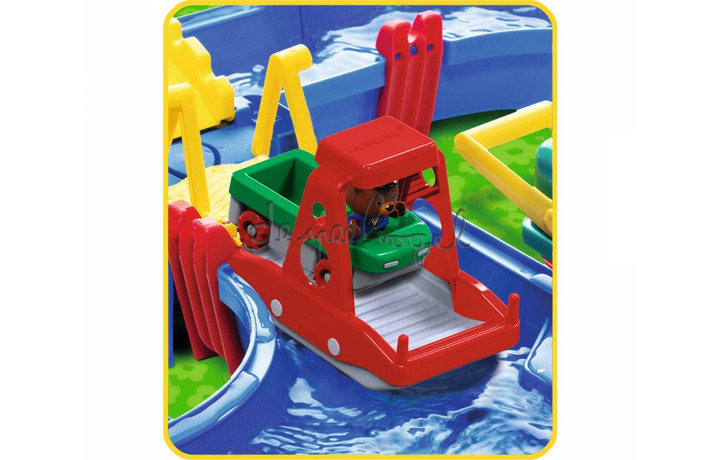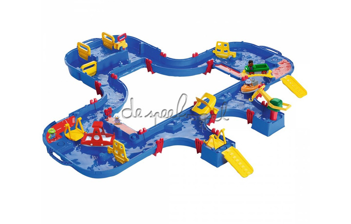 De set bevat de hele AquaPlay-poppenfamilie; de Beer, Kapitein Bo, Wilma de Nijlpaard, Lotta de Eend en Nils de Kikker. Laat Bo de voertuigen door de verschillende speelstations navigeren; Wilma zal de kraan gebruiken om de containerboot in de haven te lossen en Lotta zal laten zien hoe de veerboot bij het veerstation kan worden aangemeerd. De amfibieauto kan van het land het water in rijden over een scheepshelling of op de veerboot. De voertuigen kunnen daarna hun reis voortzetten door het populaire sluissysteem waarbij u het waterpeil regelt door middel van de pomp en door het verplaatsen van de sluisdeuren. Bij het draaien van het schoepenrad wordt het water in beweging gebracht, AquaPlay is een speelse manier om te leren hoe het water beweegt, optilt en klimt.