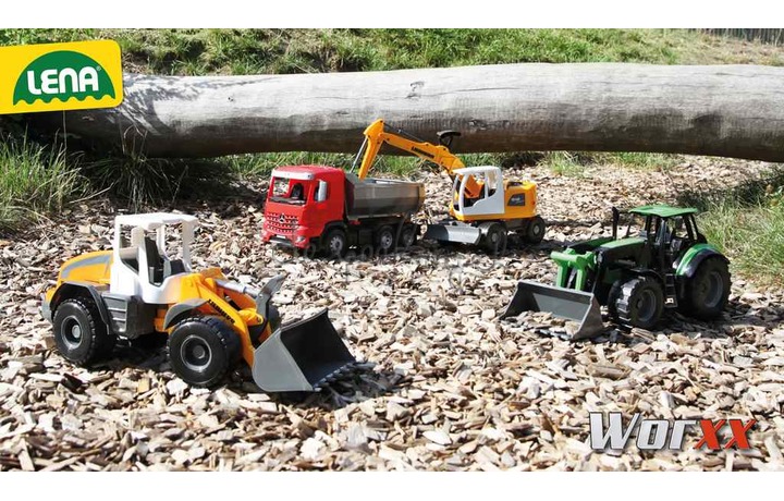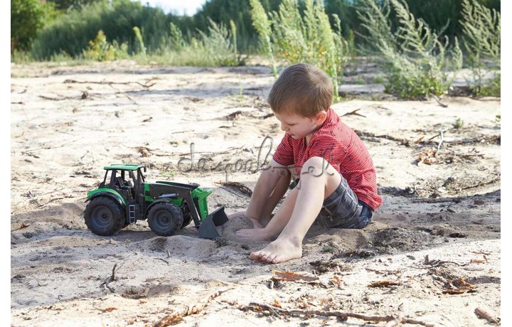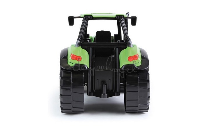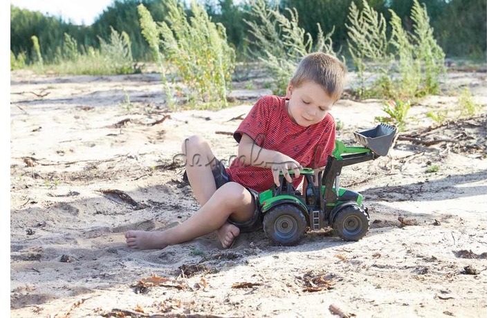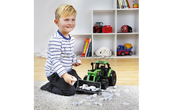 Het 45 cm lange voertuig in een robuust ontwerp is geschikt voor binnen en buiten spelen. Het groen met zwarte voertuig in een modern en gedetailleerd ontwerp is uitgerust met 6 mm gegalvaniseerde stalen assen en biedt geweldige speelfuncties - zo kunnen de tractorschop en de tractorarm op twee niveaus worden versteld en vergrendeld.
