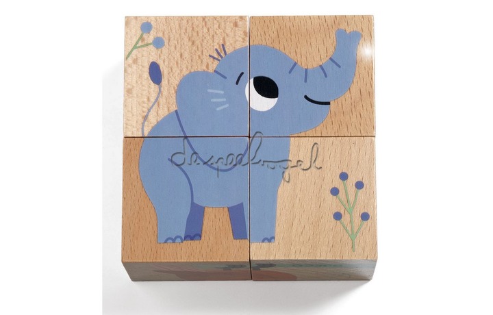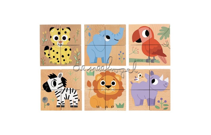 Kleine blokpuzzel met 4 blokjes om 6 wilde dieren te vormen.