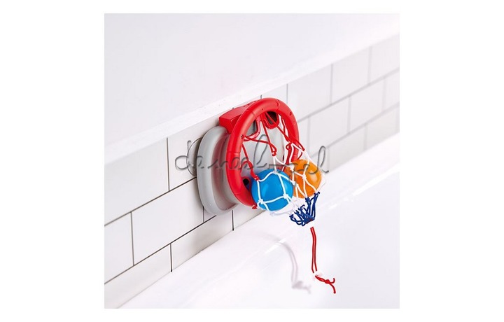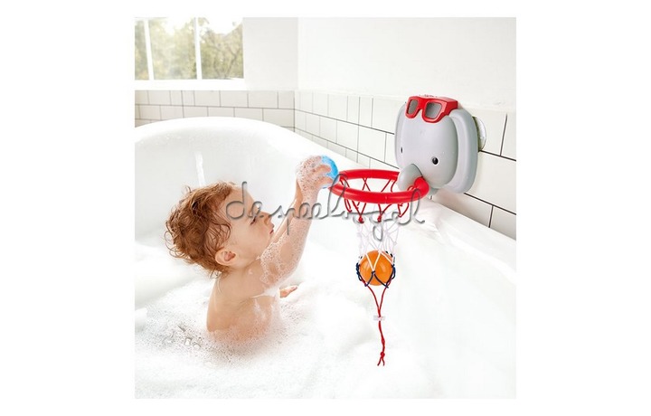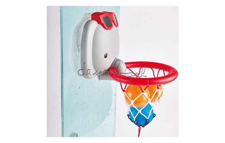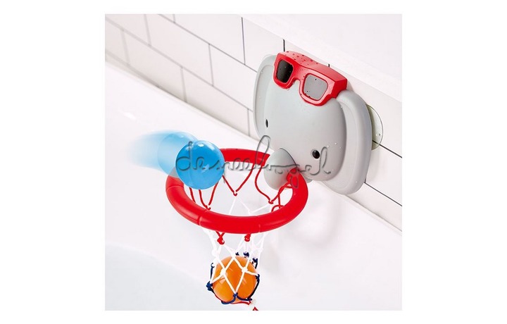 Met de olifantenbasketbalring kan het zwemplezier beginnen. De olifant heeft een zuignap aan de achterkant van zijn kop, waarmee hij aan de badkamermuur is bevestigd. We gaan! Nu kun je proberen de vier ballen in de mand te gooien.