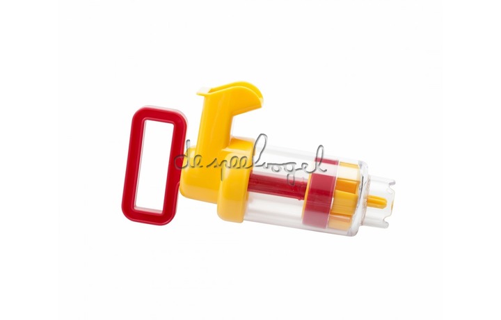 Maar het is ook ideaal voor spontaan waterplezier. Wanneer de pomp in het water wordt geplaatst en de hendel handmatig omhoog wordt getrokken, zuigt hij zichzelf op met water en pompt deze door de gele opening wanneer de hendel wordt ingedrukt. Dankzij het transparante lichaam kunnen de kinderen op elk moment het waterpeil observeren.