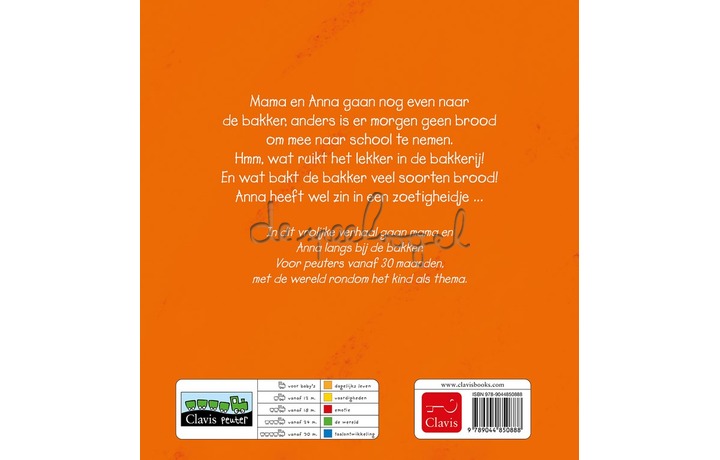 Mama en Anna gaan nog even naar de bakker, anders is er morgen geen brood om mee naar school te nemen. Hmm, wat ruikt het lekker in de bakkerij! En wat bakt de bakker veel soorten brood! Anna heeft wel zin in een zoetigheidje … In dit vrolijke verhaal gaan mama en Anna langs bij de bakker.