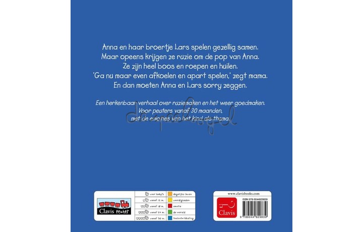 Anna en haar broertje Lars spelen gezellig samen. Maar opeens krijgen ze ruzie om de pop van Anna. Ze zijn heel boos en roepen en huilen. 'Ga nu maar even afkoelen en apart spelen,' zegt mama. En dan moeten Anna en Lars sorry zeggen.