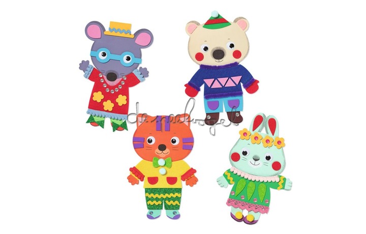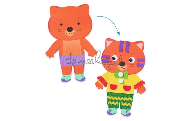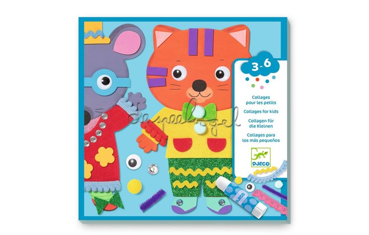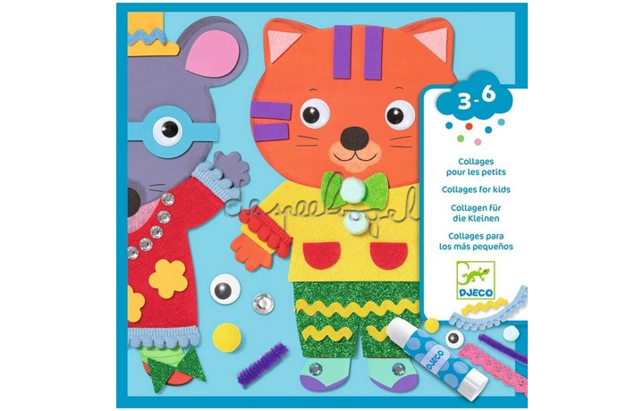 Een complete plakdoos om 4 silhouetpersonages te versieren met uiteenlopende onderdelen en gevarieerde texturen (vilt, schuim, lovertjes, lintjes, pomponnetjes, beweegbare oogjes). Het kind kiest een plaat en plakt de onderdelen erop om ze te versieren. Heel veel verschillend materiaal dat geplakt kan worden op het dikke karton. En een ongelooflijk schattig resultaat!