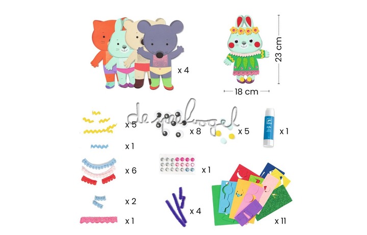 Inhoud: 4 silhouet-personages van dik karton, 1 lijmstick, talloze onderdelen om te plakken (vilt, schuim, lovertjes, lintjes, pomponnetjes) om de kaarten te versieren en 1 boekje met stap-voor-stap uitleg.