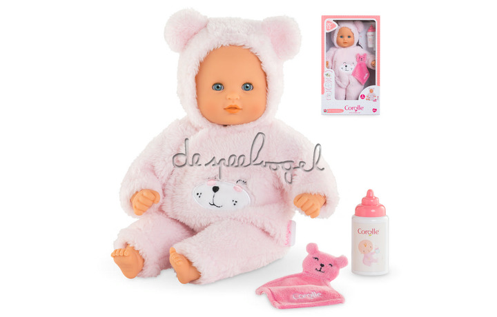Deze kleine baby heeft een witte huid en blauwe ogen. Haar gezicht, armen en benen zijn gemaakt van zacht aanvoelend vinyl en hebben die delicate vanillegeur die zo herkenbaar is van Corolle-poppen. Met zijn slaperige ogen slaapt hij als je hem op zijn rug legt.