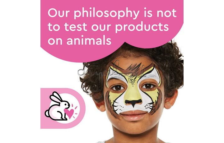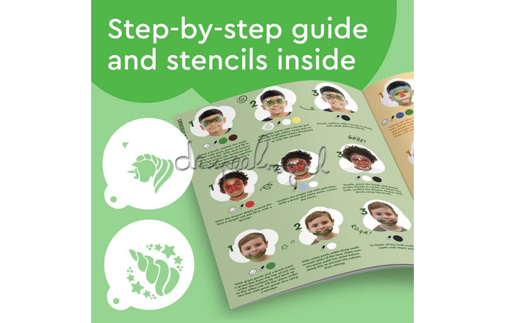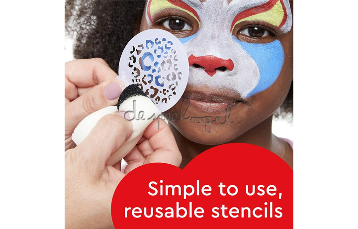 8x2ml Wit, Zwart, Lichtgeel, Fuchsia Roze, Lichtgroen, Metallic Goud, Sparkle Blauw en Sparkle Lila, 1 penseel, 1 spons, 2 stencils en een stap-voor-stap handleiding voor schminken.