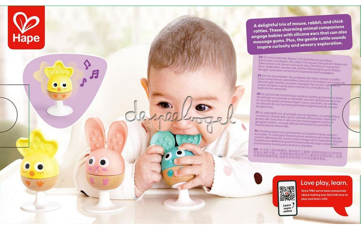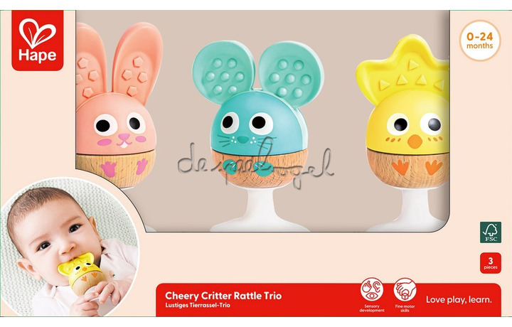 Met de Cheery Critter Rattle Trio van Hape beleeft je baby eindeloos speelplezier! Deze schattige set bestaat uit drie vrolijke dierenvriendjes – een muis, een konijn en een kuiken – die zachte rammelgeluiden maken en helpen bij de ontwikkeling van zintuigen en motoriek. De siliconen oortjes werken ook als bijtspeeltje en bieden verlichting bij doorkomende tandjes.