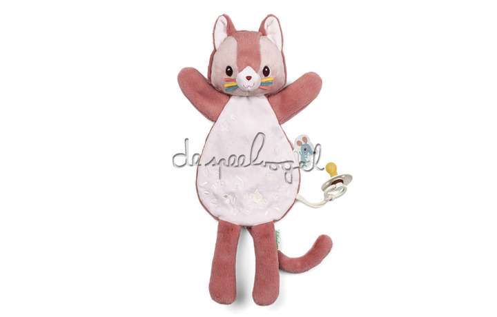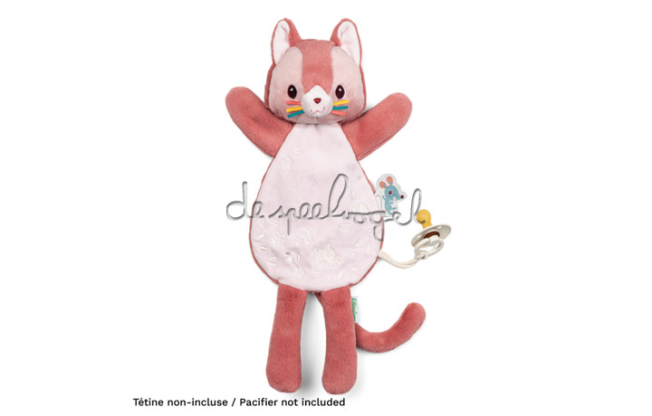 Geschikt vanaf de geboorte, deze knuffel Jeanne de kat heeft alles om te behagen. Hij is in de eerste plaats een constante metgezel voor de baby, heel zachtaardig en met een lachend en vriendelijk gezicht. Baby neemt zijn roze knuffel overal mee naartoe en blijft de hele dag zelfverzekerd en gekalmeerd. Het is ook een knuffel met poppen! Steek je vingers in de armen van de kat en achter het hoofd, en laten we voor de show gaan! Wist je dat onze lieve Jeanne dol is op spelen in de tuin? Laat haar dansen, kinderliedjes zingen, "kiekeboe" spelen... Genoeg om je kleintje te vermaken en geweldige momenten van medeplichtigheid te delen! Maar dat is nog niet alles: het is een glow-in-the-dark knuffel. Na een dag spelen en knuffelen is het tijd voor een goede nachtrust. Met een glow-in-the-dark knuffel wordt de baby gerustgesteld in het donker en raakt hij het nooit kwijt. Doe het licht uit, en observeer de buik, oren en neus van deze geborduurde knuffel: wat een mooie rustgevende gloed! Het extraatje van deze lilliputter knuffel is de geïntegreerde fopspeengesp, ideaal om hem nooit meer kwijt te raken, dag en nacht. Om de gegevens van de kleine eigenaar van deze knuffel op te schrijven, wordt een etiket in de vorm van een muis meegeleverd.