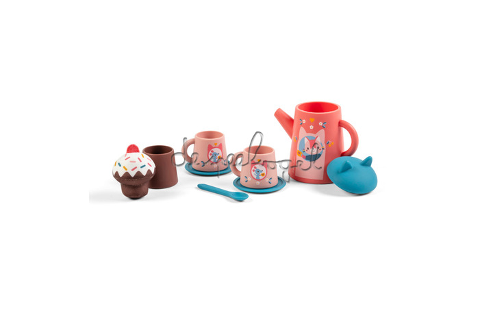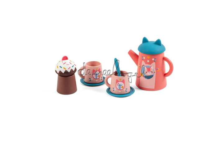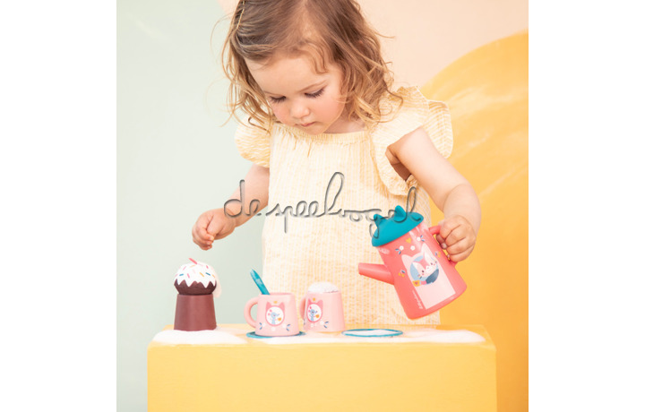 Deze theepot en de bijbehorende accessoires zijn ideaal om in en uit het water te spelen en doen denken aan een speelkeukentje. Ze zijn perfect om de fantasie van volwassenen te imiteren! Deze theeset bestaat uit 9 delen en bestaat uit: een theepot met de afbeelding van kat Jeanne en een siliconen deksel met kleine kattenoren, twee kopjes met muisjes erop, twee schoteltjes, een klein lepeltje en een tweedelige muffinvorm voor eenvoudig onderhoud. Wij gieten, wij morsen, wij schenken... Welke andere plek is daarvoor beter geschikt dan de badkamer? Misschien weet u het al, maar onze Jeanne houdt ervan om thee te drinken met haar vriendinnen. Het is tijd voor haar om te ontspannen, een beetje zoals badtijd! Dit fantasiespeelgoed is geschikt voor zowel water- als keukenplezier. Met zijn gastronomische accessoires nodigt hij uit tot gezelligheid op elk moment van de dag! Een hapje eten met oma? Een grote plons in het bad? Een gietbeurt om af te koelen op een warme dag? Het zijn de kinderen die beslissen!