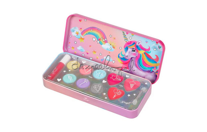Ontdek de betoverende Make-up case Unicorn, gevuld met sprankelende oogmake-up, zachte blush en glanzende lipgloss in prachtige zomerse kleuren.
